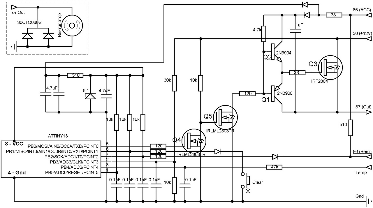 3) Моё мнение намного лучше бы сделать программно в ЭБУ старт вентилятора пораньше на 5гр.(нужно подобрать, чтобы вентилятор не молотил долго) , а в схему питания добавить мягкий старт, например от минимального уровня пускового напряжения до максимума например за минуту(летом уменьшать время, зимой увеличивать).