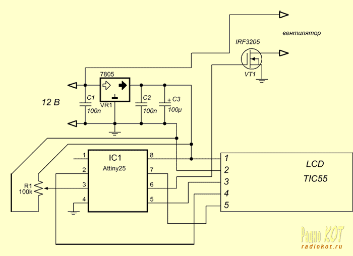 Друзья!Рекомендую схему управления вентилятором охлаждения,собрал пару лет назад,проверена,лично доволен.Суть в том что обороты пропеллера меняются в зависимости от температуры,начало вращения около 90-92 град.,полные обороты при 97-99.Можно конечно купить готовый блок,это порядка 3т.р.,себестоимость деталей этой схемки всего около 200-300 руб.,только руки приложить