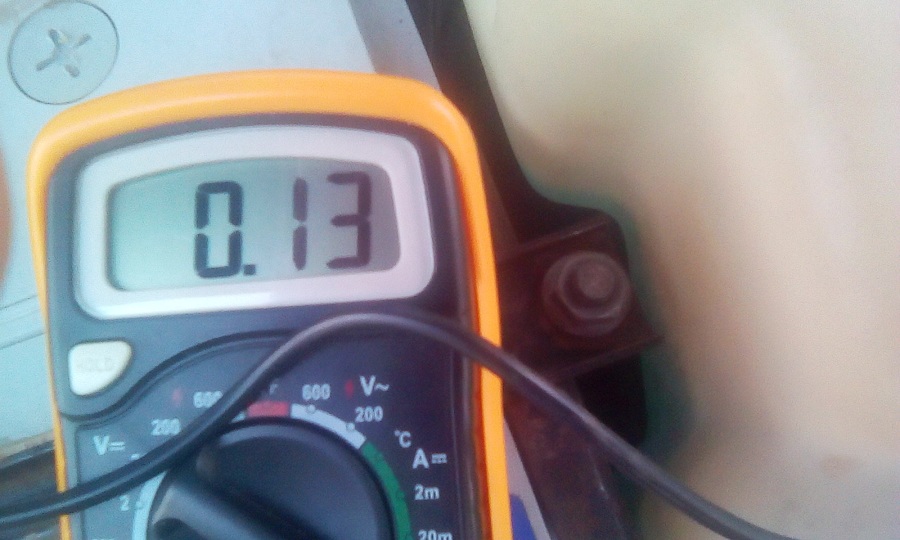цепляешь один щуп на болт клеммы. Второй прижимаешь под клеммой к контакту аккумулятора и снимаешь клемму.