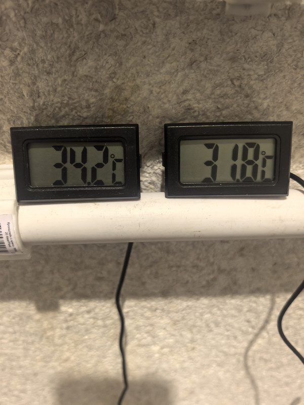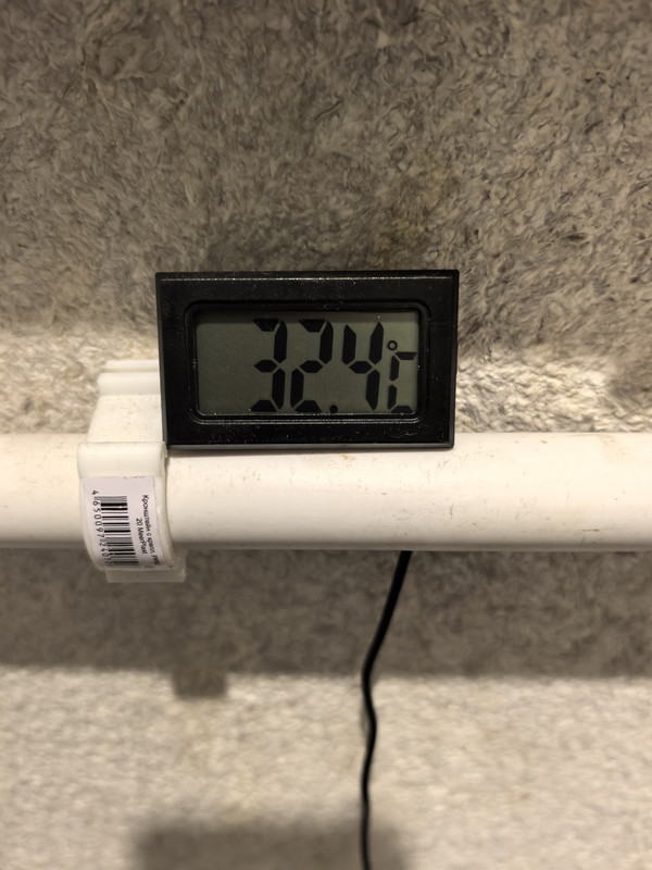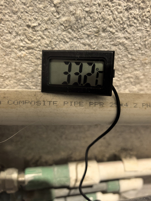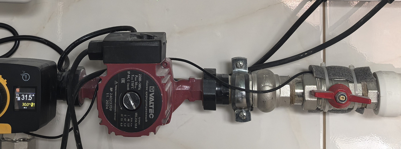 Потом купил еще такой датчик, закрепил на коллекторе обратки теплого пола. Правда я чуть покрутил кран подмески, и в такое же значение как было, не попал (стала чуть горячее подача). Так вот на обратке стабильно 31.8 - 31.9 градуса, при этом на подаче 33.7 - 34.2. Справа датчик на обратке, слева на подаче.
