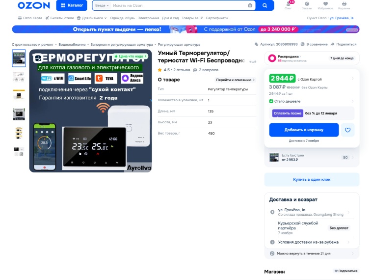 Также наткнулся на Озоне и заказал вот такой терморегулятор. Прикольный модный, даже с тач экраном Smile) Всего 3 рубля (скидка 71 процент - надо брать). В нем беспроводной модуль-показометр (второй модуль устанавливается в газовый котел), к вай фаю подлючается. С Алисой даже работает, и на телефоне откуда угодно будет видно температуру в доме и можно котлом управлять. Поозорую Smile) Прикину куда поставить (пока не понял, но полом теплым он управлять не будет).