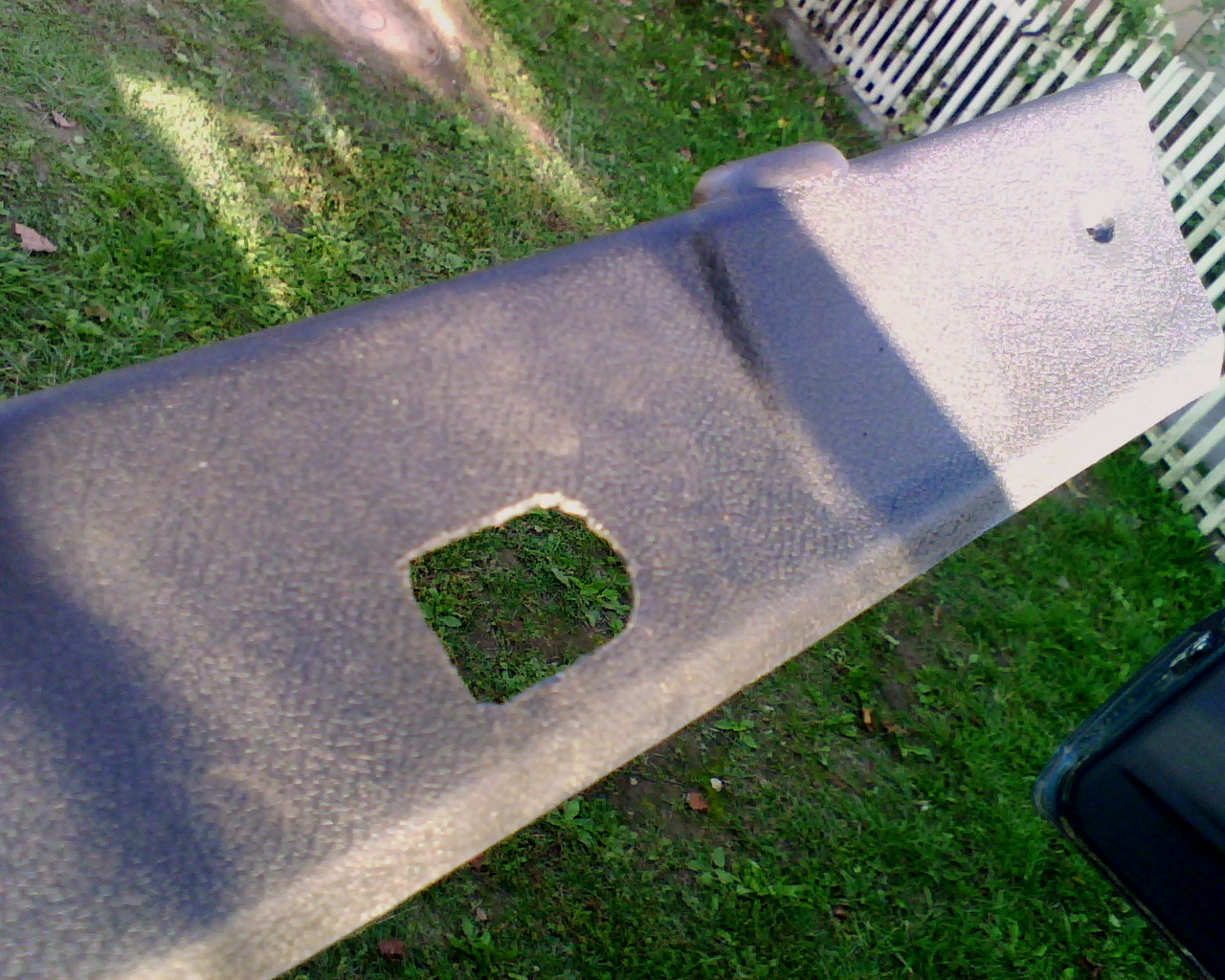 Вынимаем обивку и дорезаем родное круглой отверстие до следующего вида. Я эту работу выполнял острым ножом. |