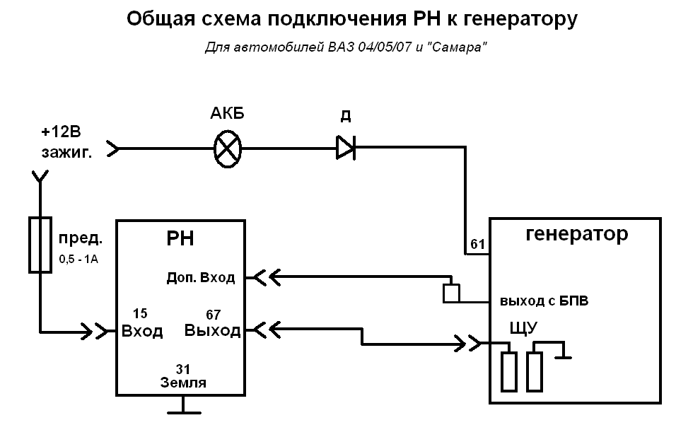 Общая схема подключения альтернативного РН для автомобилей ВАЗ пятого семейства и Самары показана на рисунке схема 1_1.PNG. Для автомобилей ВАЗ "копеечного" семейства (если использовать генератор типа 37.3701) показана на рисунке схема 2_1.PNG.