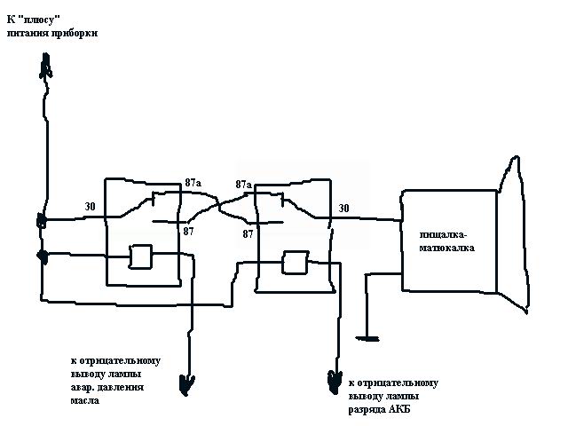 tchm14, выкинуть из твоей схемы и второе реле, просто соединив пищалку с D+ и проводом к датчику давления. Только нужно к пищалке приспособить маломощный диодный мостик, так как плюс к ней может придти или со стороны генератора, или со стороны датчика при неисправности в генераторе.