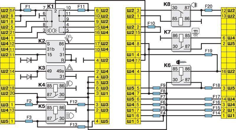 Зелено-черный и коричнево-голубой провода идут от 11-х выводов обоих колодок приборки, т.е. от ламп сигналов дальнего света и ручника.
