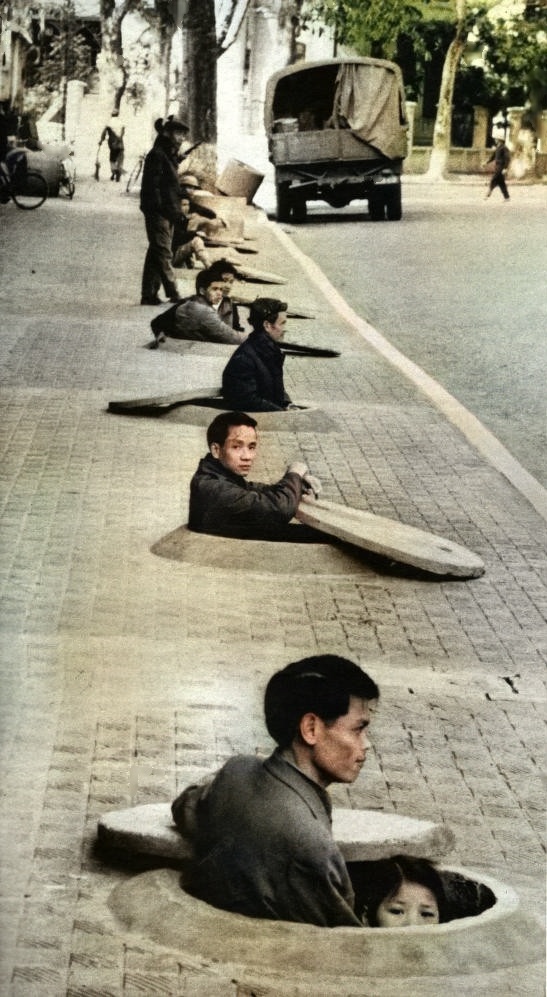 Цитата:На некогда элегантных бульварах Ханоя пробурены одноместные отверстия глубиной полтора метра, предназначенные для защиты от осколков американских бомб. Сначала вы слышите оглушительный рёв зенитных ракет. Затем завывают, воют и визжат сирены. Улица, ещё несколько мгновений назад кишащая пешеходами и велосипедистами, внезапно пустеет: люди исчезают в ямах глубиной в человеческий рост, вырытых в тротуарах, словно бесконечная цепь водостоков. Ополченцы взбираются на крыши и готовят автоматы. Тишина опускается на Ханой на шестьдесят секунд.
