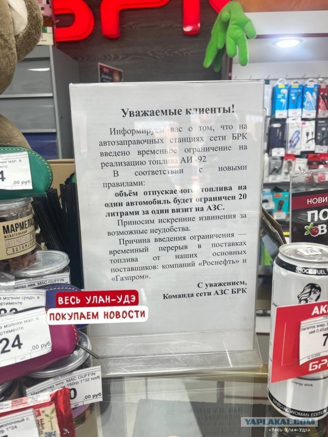 Сеть АЗС БРК (работает в Иркутской области, Бурятии и в Забайкалье) ограничила отпуск бензина марки Аи-92 в регионах присутствия до 20 литров каждому покупателю.