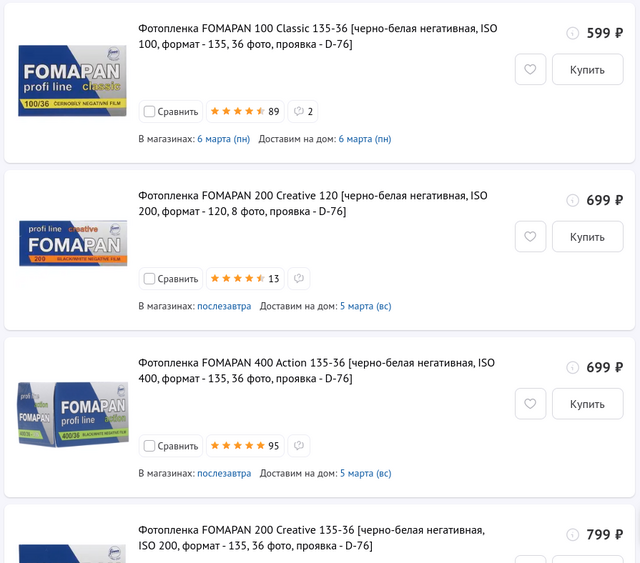 или на озоне у нас есть варианты с пленкой ТАСМА. Ну примерно как Фома. за 600 с копейками со скидками бывает. На эксперименты или освоение ЧБ вполне.еще Славич фотохимию делает смотри там же.. Фотобумагу. Т.е. в принципе в ЧБ вполне можно возвращаться. С цветом труднее, но тоже можно.