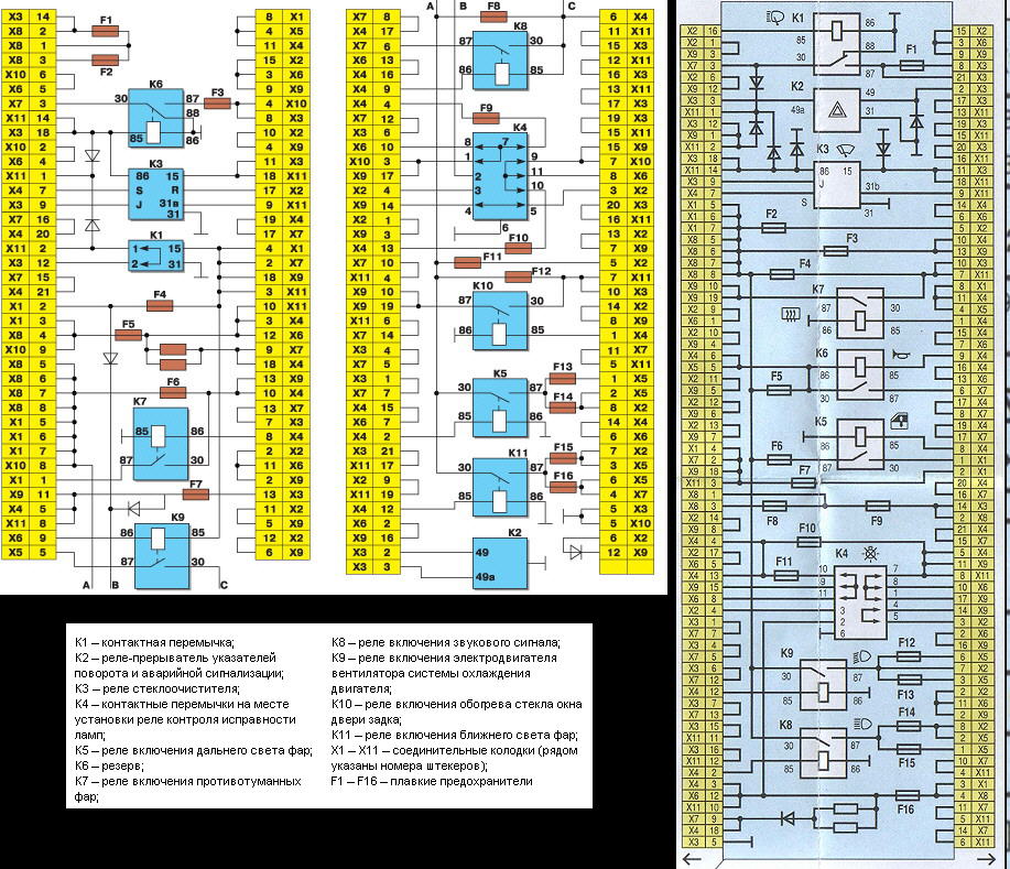 Вот слева как раз схема моего блока. Реле К7 - это реле стеклоподъемников, а предохранитель F6 - предохранитель стеклоподъемников,задних стопов и плафона салона. На реле ПТФ в этом блоке идет X8-1, а на сами ПТФ соответственно X8-2 и X8-3.
