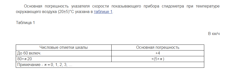 Если твоя реальная скорость, например, 75 км/ч, то она попадает в диапазон от 60 до 80, а это n=0 (т.е. 80+0х20=80). Тогда спидометр имеет право показать 75+(5+0)=80 км/ч.