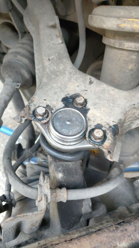 Когда крайний раз к ашотикам гонял, попросил подёргать ходовую, а то всё гремит. Выяснилось, что передней левой верхней шаровой нету. Ну я ж не просто так полгаража инструмента купил, в пятницу после работы приехал, открутил шарик от рычага (вон какая конструкция)