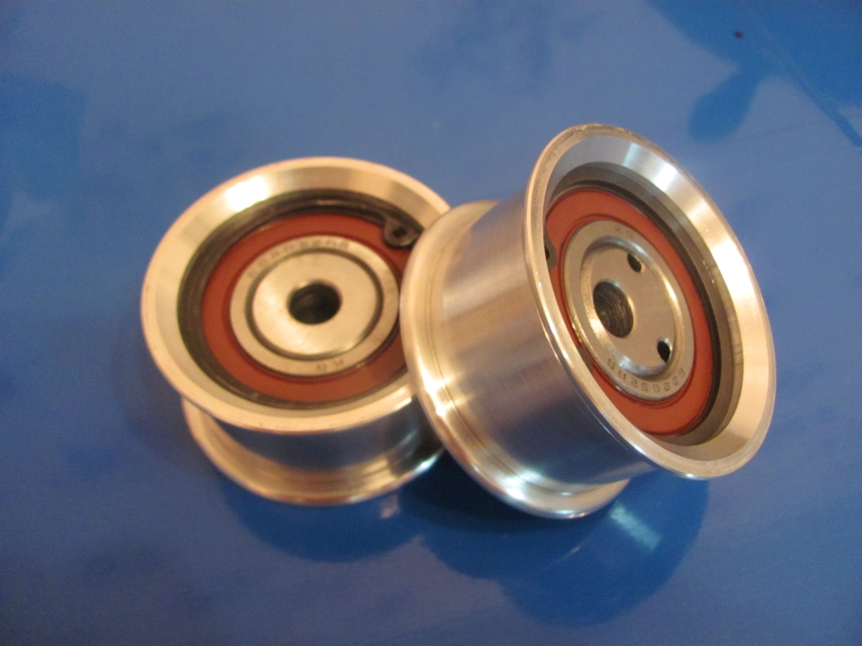Ну вот решили с другом установить один из двух комплектов самодельных роликов, так как у него давно уже мотор работает очень шумно, издавая разные посторонние звуки Рассказываю.... было решено опробовать способ замены роликов без снятия ремня ГРМ. Сняли крышку, зафиксировали шестерни РВ приспособой из журнала ЗР, открутили естественно гайки с роликов. Начали с натяжного...после получасового танца с бубном попытка вытащить ролик не снимая ремня с шестерней РВ не увенчалась успехом. Плюнули, терять нечего, стаскиваем ремень с этих шестеренок и в течении 2 минут производим замену роликов. По поводу старых... пробег на них макс 8 тс. Один как бы вологодский, крутится нормально, люфтов нет, но шум жутчайший. Вероятно может помочь смазка.. Второй, натяжной, зеленый LGR, такое ощущение что в нем деформировались ролики, по ощущению отсутствует плавность хода, прям перекатывается внутри. Но не суть.. и так ролики на месте пытаемся натянуть ремень, 10 мин ремень на месте!!!! Натянули, затянули, ключ на старт.... машина работает но шумит не слабо и стружки алюминиевые летят из под роликов. Визуально ремень смещен вплотную к наружнему буртику роликов. Решаем снимать, и устанавливать шайбы...Я знал что они наверняка понадобятся и здесь про это говорилось, но как всегда понадеялся на лучшее, не подготовил за ранее. Но нам повезло находим в гараже 2 шайбы диаметром примерно 30 мм (к сожалению не замерил) и толщиной 2 мм (замерил точно!) Снимаем, устанавливаем (теперь на все ушло не более 10 мин.) С обоих торцов буртиков роликов и ремнем имеем зазор. Заводим.....тишина!!!!!!!!!!!! работает супер, роликов вообще не слышно!!! Ура!!! Выводы: замена роликов не снимая ремня возможна! нужно подкладывать шайбы, я бы порекомендовал все же 2,5 мм (конечно нужно смотреть по ситуации), покупной ключ для натяжки ремня не подошел (отверстия в натяжном ролике немного меньше по диаметру, но у меня был свой самодельный, он точно подошел). Регулировка проблем не вызвала, Теперь будем нарабатывать ресурс, а потом можно будет делать выводы. Мой комплект еще не установлен, как что все будет учтено!!!