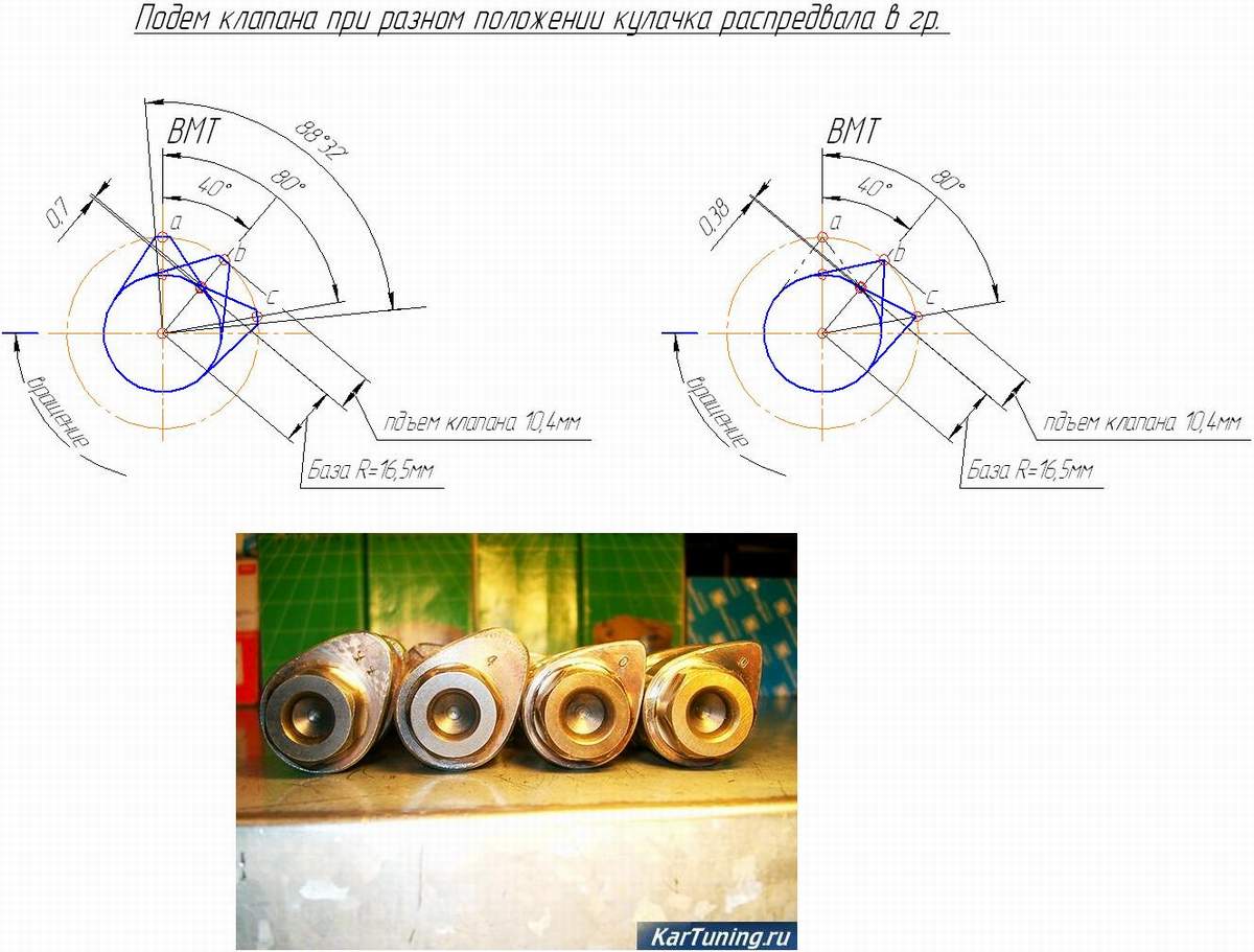 Кулачки с увеличенным подъемом при изготовлении вписываются в существующую литую заготовку, поэтому по мере увеличения подъема базовый диаметр кулачков уменьшается. Уменьшение базового диаметра кулачков связано также с тем, что для обеспечения кругового проворота кулачка в ГБЦ приходится снимать (буквально – срубать) мешающие места в зоне вращения кулачка, и чтобы не усложнять эту доработку, также необходимо ограничиться неким предельным вылетом кулачка.