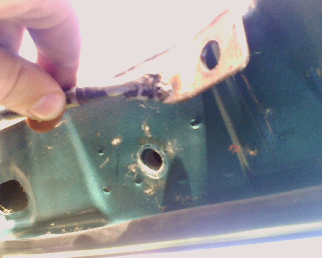 Сверлим отверсия в пластиковых боковинах в местах указанных на фото. (На фото левая плассмаска, взгляд со стороны крышки багажника)Даметр 9 мм. |