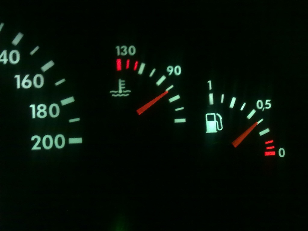у меня также. Кстати, при тесте приборки, стрелка не доходит до максимума ровно на столько, как и до 90 гр. при прогретом двигателе.