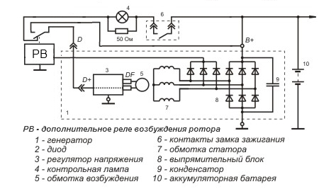 В крайнем случае, чуть выше по тексту я описал, что цепь контрольной лампы можно соединить с выводом "D" РР. Тогда не понадобится пятиконтактное реле, достаточно будет четырехконтактного с нормально-разомкнутыми контактами.