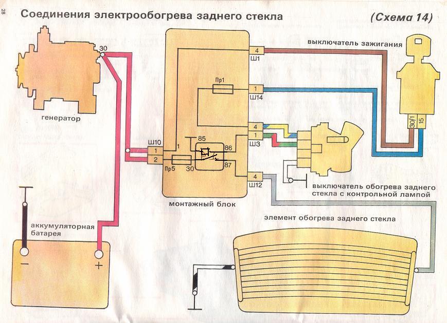 У меня обогрев заднего стекла не работал. Дай, думаю, попробую подключить. Разобрал бороду, от кнопки через лампу включения обогрева заднего стекла подключил, дальше не могу найти идут ли провода к обогреву или нет. Взял просто провод и через салон к нитям подключил. Так, чисто для проверки. Включил кнопку обогрева, напряжение по вольтметру на панели приборов просело, аж стрелка в середину красной зоны ушла. Что самое интересное: подогрев работает. Завожу машину - заводится, несмотря на то, что стрелка в красной зоне. Ну, это я так, на дурака подключил. А как по правильному должно быть? Я вот не знаю, может там через какое сопротивление подключается или еще как? Посмотрел по общей схеме, ничего внятного там не нашел по подключению обогрева.