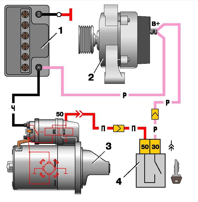 Всем привет! Машинку (21102) купил недавно,и вот какая проблема у меня вчера возникла: сажусь утром за руль,поворачиваю ключ в положение "старт"-и тишина...при этом вижу на борт.комп,как падает напряжение.Повторил процедуру несколько раз-ничего не произошло.Сначала подумал на АКБ,хоть и новый,а подзаряжать надо в такие морозы,-снял,отнес домой,зарядил и отогрел.Вечером поставил на место-и опять тишина...Дернули другой машиной-завелась с "полпинка" (да простит меня инжектор ))),погрелся,заглушил,-и опять тишина...Оставил ремонт до светлого времени суток.На всякий случай позвонил прежнему хозяину,опросив его на предмет установки доп. реле,на цепи включения стартера,т.к. тихо где-то щелкало,но где,-непонятно.Он сказал,что реле защиты точно есть,но где,и сам не знает.На следующий день,полазав по форумам,и вооружившись знаниями полез заводить "с отвертки"-в итоге кроме небольших искорок ничего не увидел.Втягивающее не втягивало,а только немного "гудело",стартер напрямую тоже не крутился.Снял его на морозе -25,ругая плохими словами Деда Мороза,и тех,кто его на гайки на 15 посадил,и отнес домой.Сходил в ближайший магазин запчастей,-там только китайский стартер с прилавка на меня грустно смотрел,за 2300 руб,((( а-девушка продавец сказала,что лучше его вообще не найти,и они вообще самые надежные в мире,по лицензии делают !!! (ну что она еще могла бы сказать ?).В итоге,не экономии ради,а удовольствия для немного сомнительного, - - я решил свой стартер КЗАТЭ распотрошить...))) Разобрал,и обнаружил полное отсутствие "+"овых щеток."-"вые немного еще остались.Ладно,щеточный узел-160 руб. цена вопроса.Помыл стартер,подчистил дорожки,что надо смазал.Но вот что же тогда со втягивающим ? Неужели тоже менять ? Ответ нашел на форуме по "классике".Я это и раньше знал,но как-то подзабыл,как на практике использовать.Как известно,втягивающее реле имеет 2 обмотки,и способ его проверки "замыканием корпуса на массу",как многие советуют,-НЕПРАВИЛЬНЫЙ.Он активирует только "удерживающую" обмотку,которая изначально довольно слабая.Вторая,"основная" обмотка берет на себя "массу" как раз через щетки стартера.Вот схема для наглядности.Для тех,кто в электрике не шарит,-поясню-"масса" подается на основную обмотку втягивающего реле через обмотку якоря стартера.Теперь все понятно,почему не втягивало реле в моем случае,и не крутился сам стартер "напрямую".