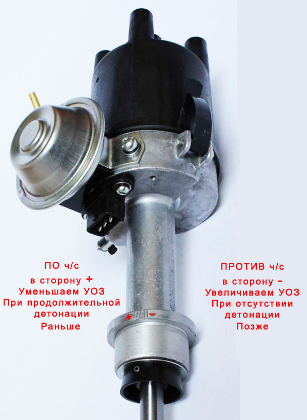 А про термины всё просто: если смотреть на трамблёр сверху, то поворот его корпуса по часовой стрелке (т.е. по направлению вращения вала трамблёра) уводит УОЗ в "поздно" (т.е. в минус); в обратную сторону, соответственно, всё наоборот