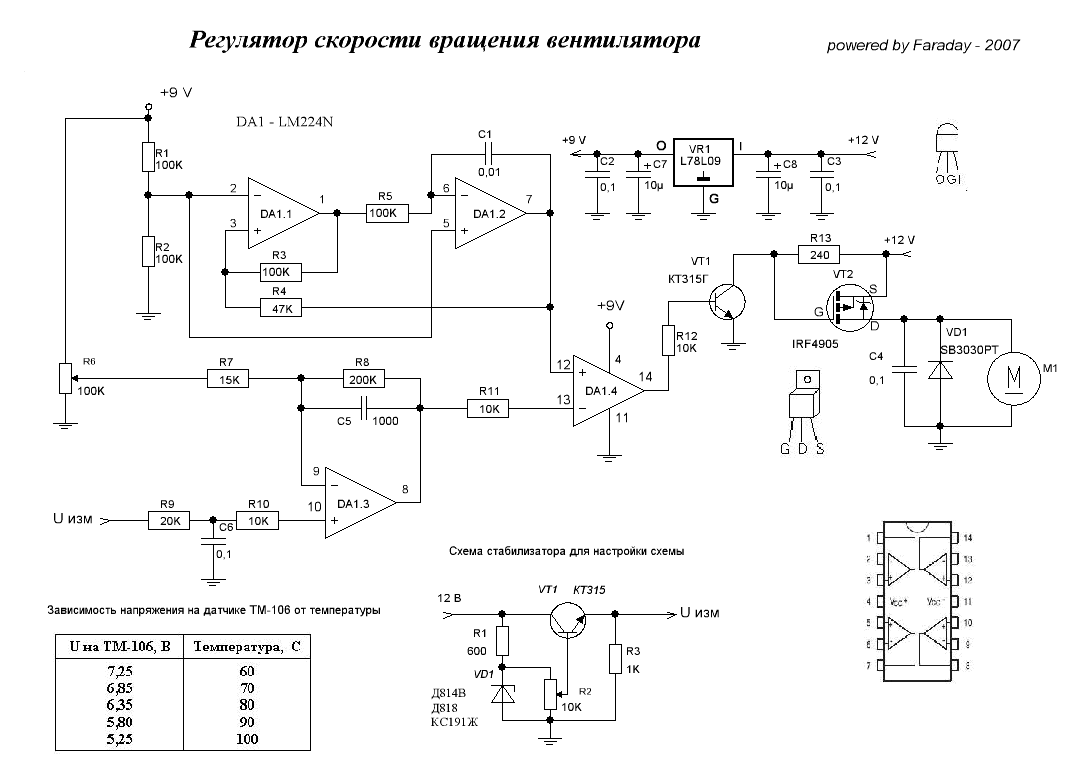 Друзья!Рекомендую схему управления вентилятором охлаждения,собрал пару лет назад,проверена,лично доволен.Суть в том что обороты пропеллера меняются в зависимости от температуры,начало вращения около 90-92 град.,полные обороты при 97-99.Можно конечно купить готовый блок,это порядка 3т.р.,себестоимость деталей этой схемки всего около 200-300 руб.,только руки приложить
