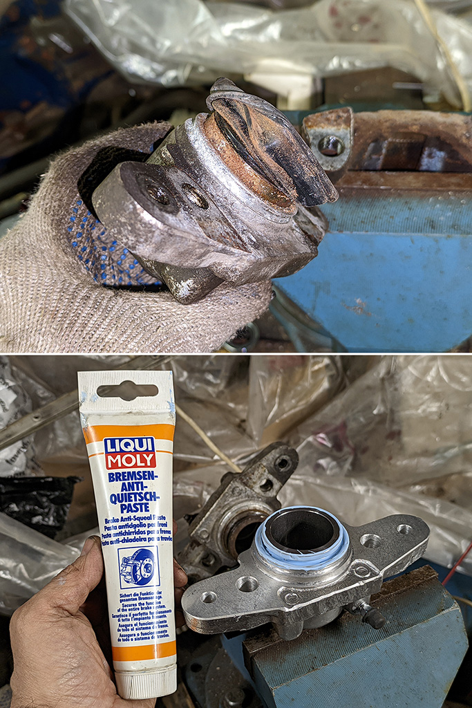 Болты крепления суппорта к скобе мазал графиткой. Смотрю - как новая. Не высохла.