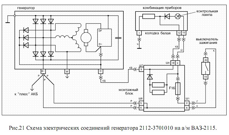 После включения зажигания вверхнее реле подаёт на регулятор напряжения 12 вольт из бортовой сети (В+). Лампочка АБ при этом на приборке должна гореть.