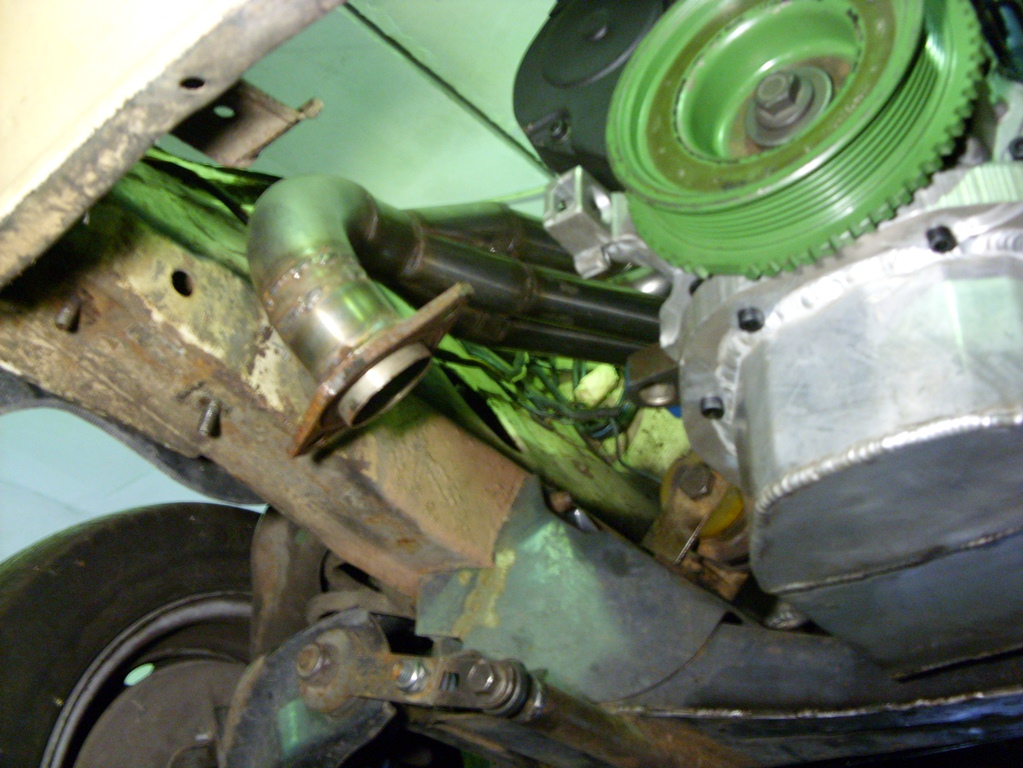 Выхлопная система 4-1 тоже полностью спроектирована и изготовлена в фирме ʺGARAGE 13ʺ. Проходит между балкой, и выводиться в бок авто, на спортивный манер. Звук получился сочный и не очень громкий (фото 10).