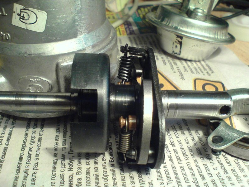 С ходу, при снятии пружины штифт просто вывалился. Тут осуждать не берусь, по функционалу, не критично, а разбирать легче. Продольного люфта практически не было. (+) Регулировочные шайбы, ну очень с заусней, моглиб хоть через голтовку пропустить. Стопорные шайбы грузиков, тупо проволочные. (-). Люфт самих грузиков вверх вниз меньше чем у АТЭ. Но можно и еще уменьшить. Нафиг такое болтание не нужно. Заусня на бронзовой втулке основной оси. Не критично, но не красиво. Подшипник вакуум корректора, заклинен напрочь! Смазки дофига, но корректировка вакуум корретора отсутствует (--). Не думаю что засорилось за два месяца эксплуатации, пока я АТЭ допиливал. Скорее всего сразу так было. Вывод. На всякий случай даже новый трамблер разобрать, и до ума довести. Теперь к главному. Пружины, в отличие от решения АТЭ, даже на вид разные. Первая токая, вторая как на АТЭ, но ушко круглое, и на вид свободный ход меньше. Плохо это или хорошо, надобно стенд городить, потом и по шкале, и на ходу проверять, насколько оно попадает в график. Снимки положил, кому интересно где-то снимал тоже на пружины АТЭ.