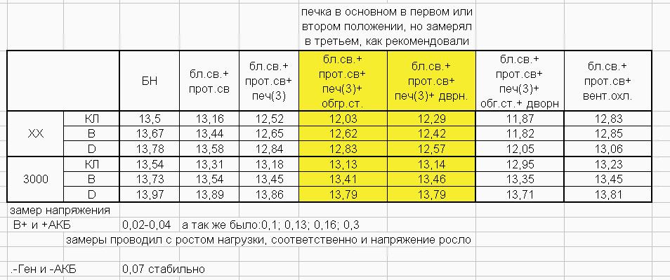 В первой таблице напряжение без потребителей было уже заниженным 13,83 В,