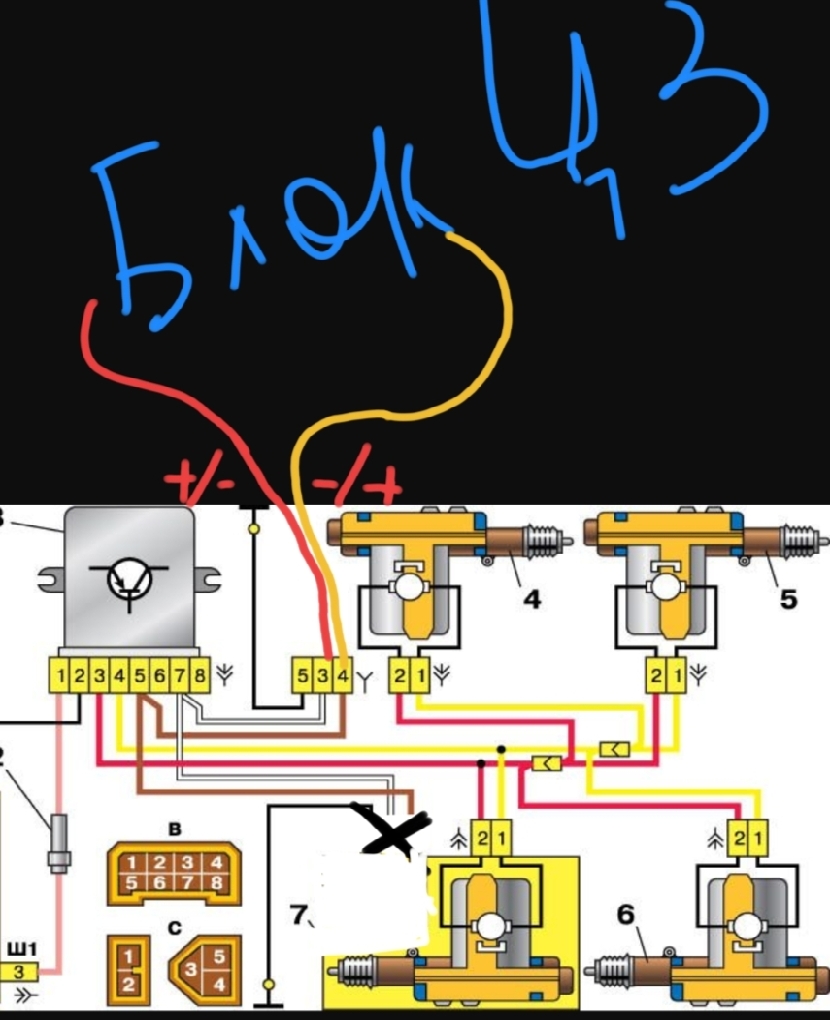 3) дополнительный блок управления стеклоподъёмниками подцеплять не на коробочку блютуз, а уже на выход с БУБД, тоесть, на красный и жёлтый силовые провода управления ЦЗ, на которых коммутируется +/- и наоборот -/+ в зависимости от команды с микрика непосредственно;