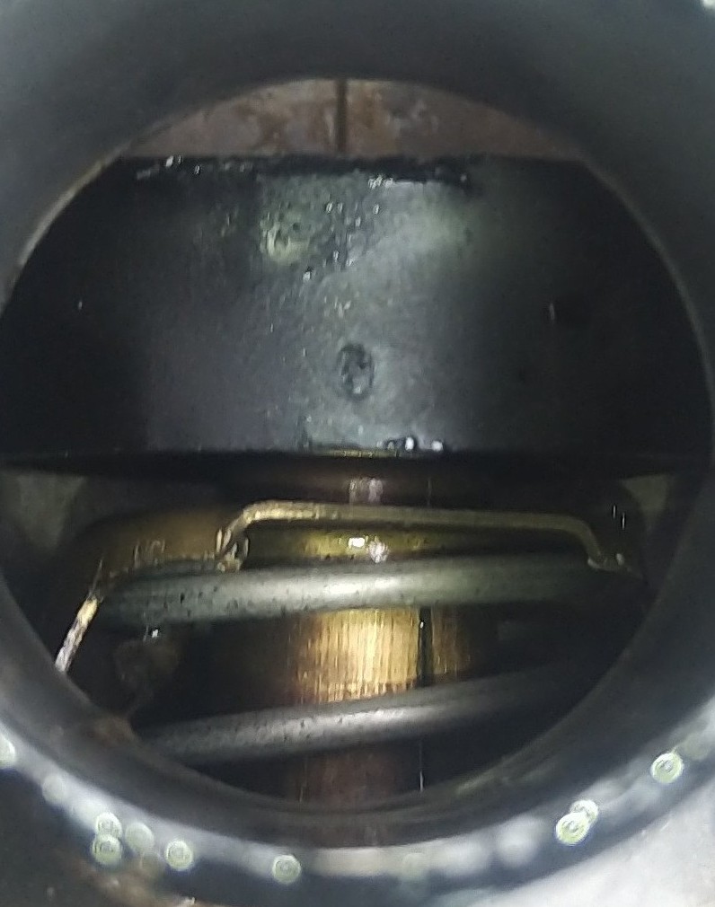 PS: если твоя фотка - это вид со стороны патрубка к помпе (насосу), то это нормальное положение "холодного" клапана термостата, т.е. открыт "малый круг" (мимо радиатора). Когда термос прогреется, этот клапан должен подняться вверх и перекрыть верхний патрубок, т.е. закрыть "малый круг" и открыть "большой", т.е. через радиатор.